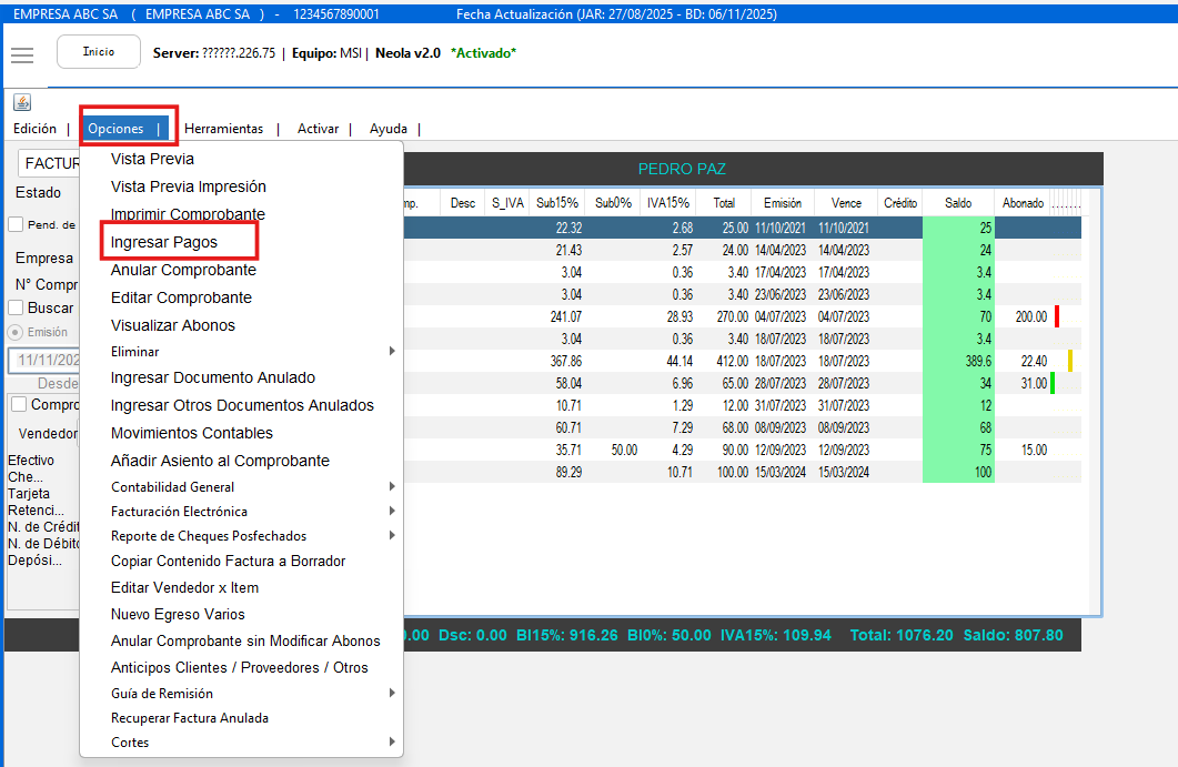 - Con la ayuda de los filtros busque la factura de compra en la cual debe registrar la nota de crédito, seleccione la factura, dé clic en “Opciones” y seleccione la opción “Ingresar pagos”.