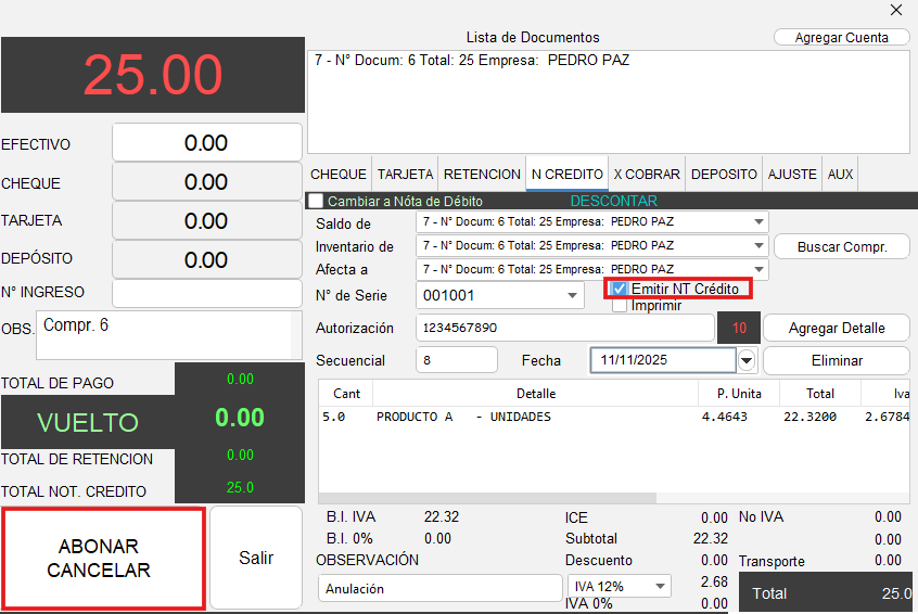 - Active la opción “Emitir NT Crédito”, automáticamente se tomará el valor total de la factura y todos los items facturados para la nota de crédito, si el valor es correcto, presione el botón "Abonar/Cancelar".