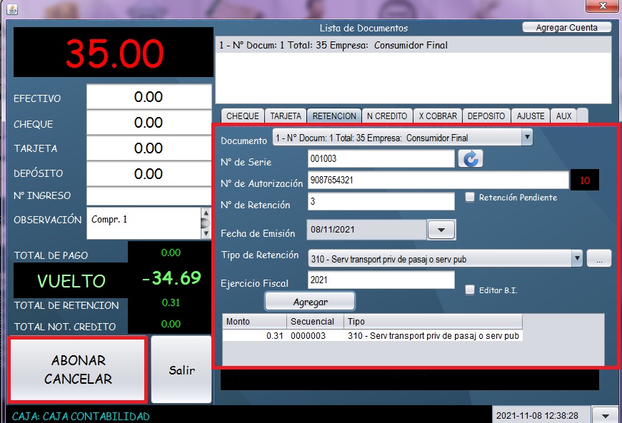 - La retención quedará registrada