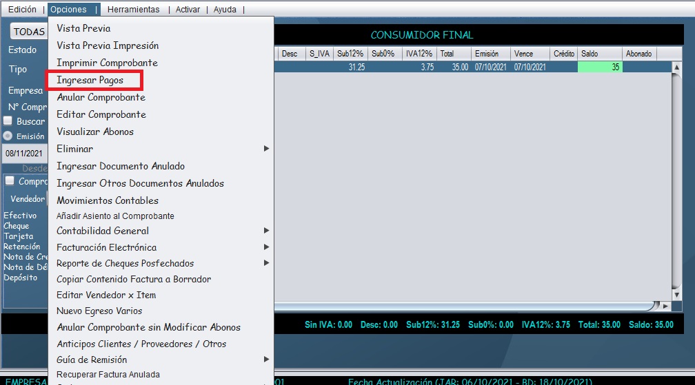 - Una vez ubicada la compra, seleccione el comprobante y diríjase al menú "Opciones" y seleccione "Ingresar pagos"