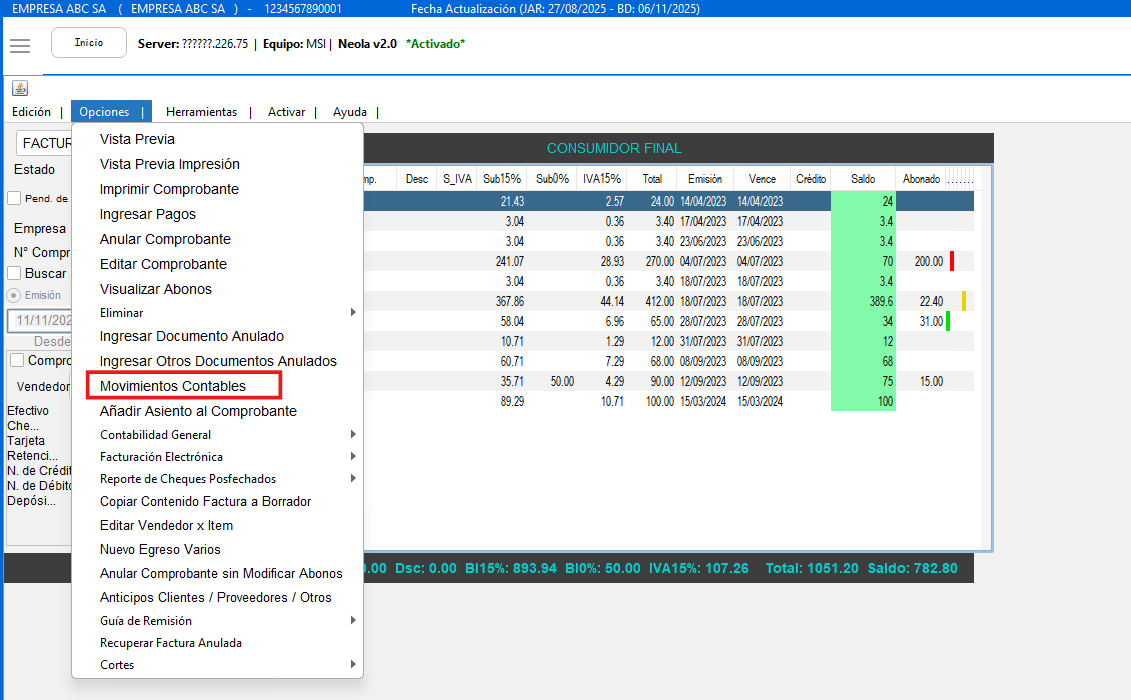 - Seleccione el comprobante del cual desea imprimir el diario, diríjase a la pestaña "Opciones" y seleccione la opción "Movimientos contables"