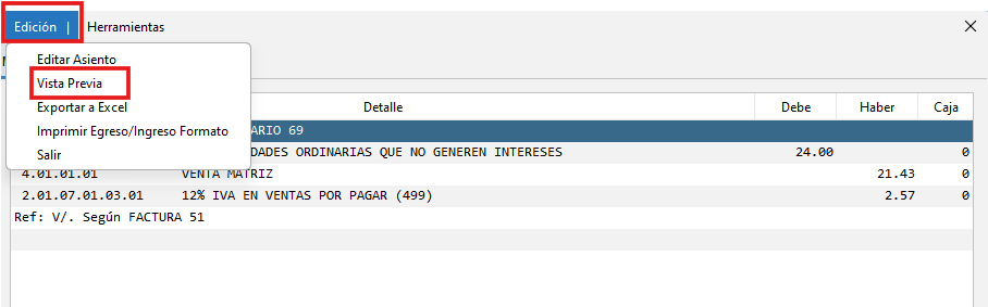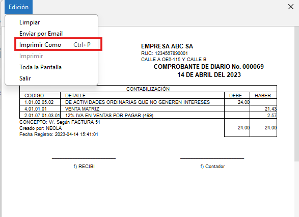- Se abrirá el comprobante de diario, diríjase a la pestaña "Edición" y finalmente seleccione "Imprimir como"