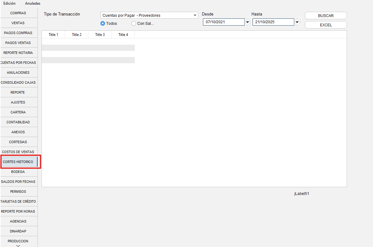 - En la pantalla, seleccione la pesta帽a "Cortes Hist贸rico"