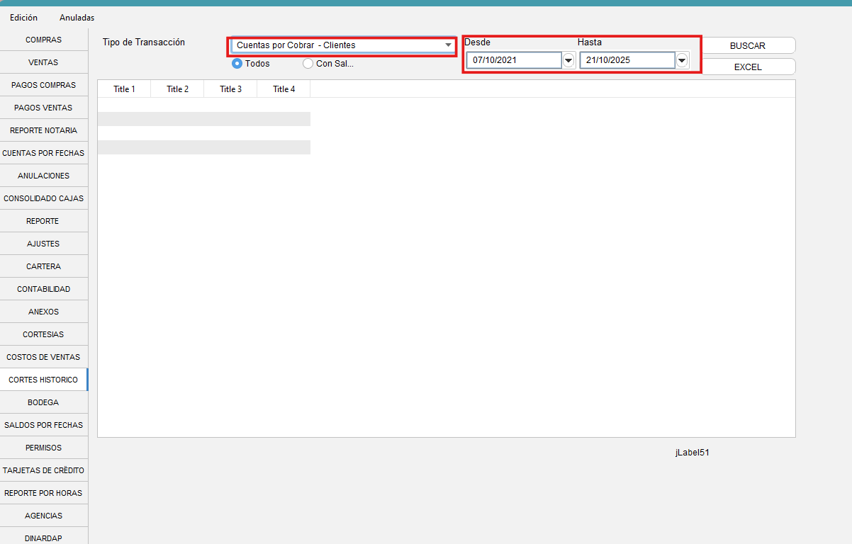 - A continuaci贸n, en la parte central de la pantalla seleccione "Cuentas por cobrar - Clientes", y coloque la fecha (en "Desde" es recomendable colocar una fecha anterior al inicio del uso del sistema), finalmente de clic en el bot贸n "Buscar".