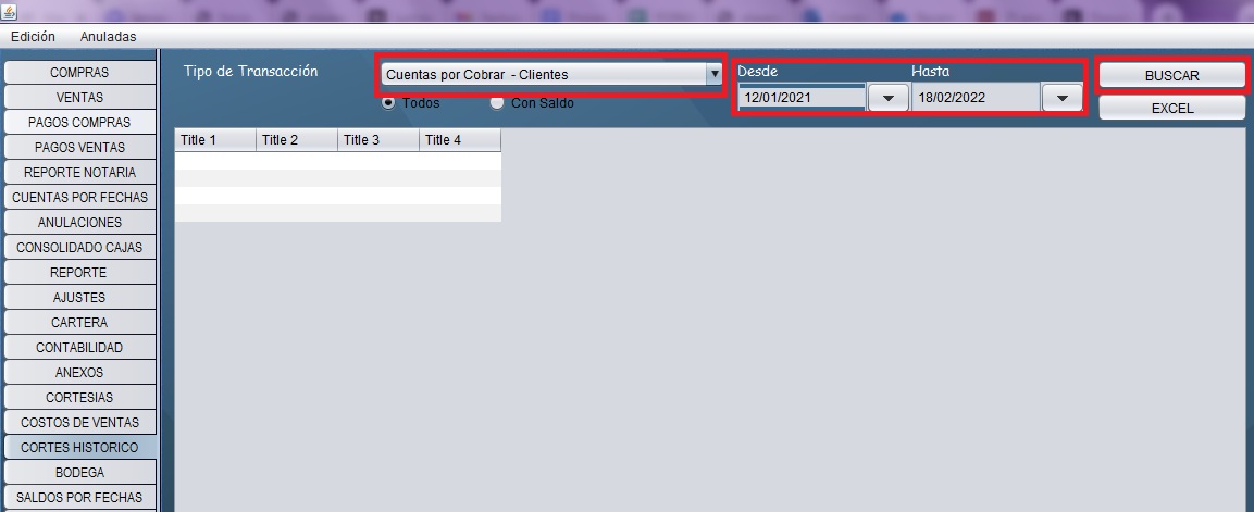 - A continuación, en la parte central de la pantalla seleccione "Cuentas por cobrar - Clientes", y coloque la fecha (en "Desde" es recomendable colocar una fecha anterior al inicio del uso del sistema), finalmente de clic en el botón "Buscar".