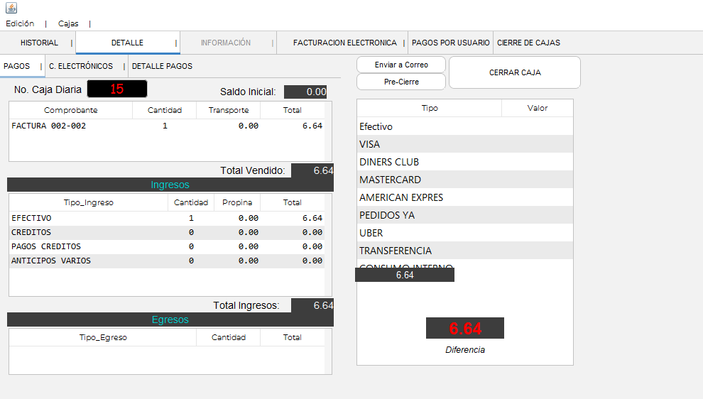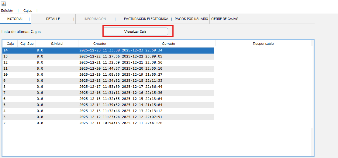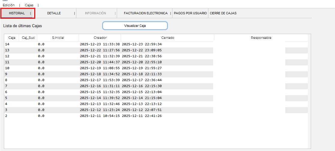 El sistema te llevará a la ventana de historial, donde podrás visualizar los movimientos de cajas en detalle 🔍.