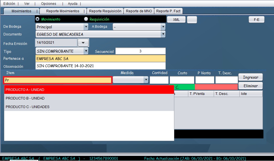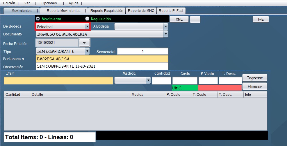 - En el caso de tener varias bodegas seleccione a que bodega se va a realizar el egreso, caso contrario seleccione bodega "Principal"