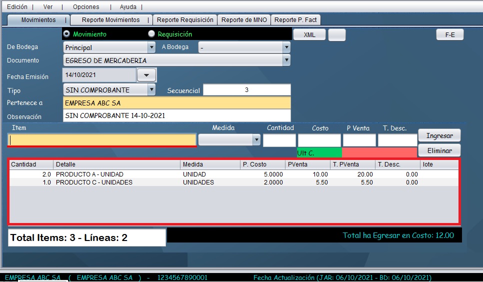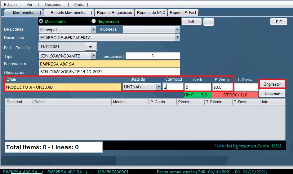 - En un sólo procedimiento puede realizar el egreso de varios productos, vuelva a ingresar todos los items requeridos, el sistema mostrará el número de líneas y el número de ítems que van a egresar en la parte inferior.