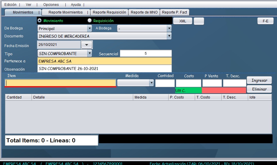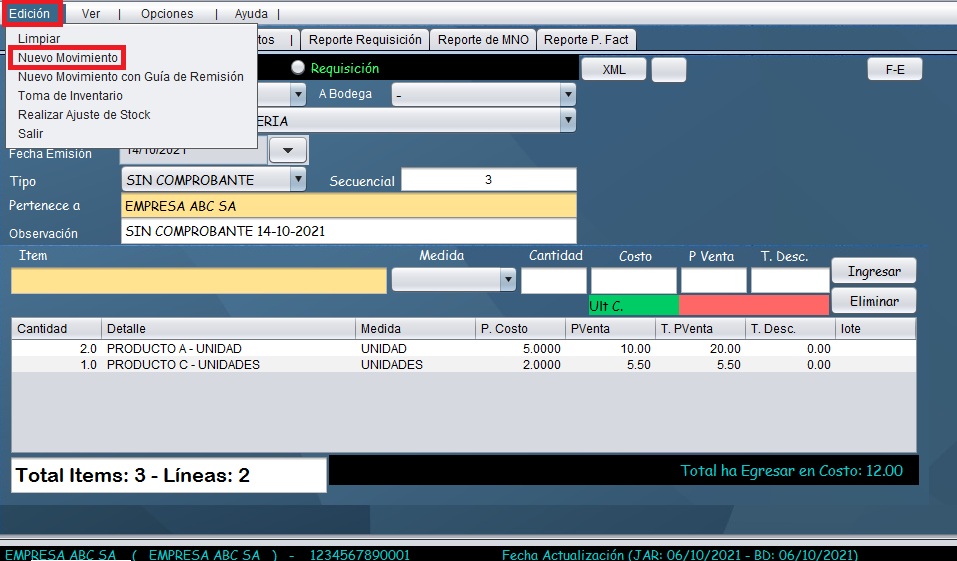 - Para guardar diríjase al menú "Edición" y seleccione la opción "Nuevo movimiento"