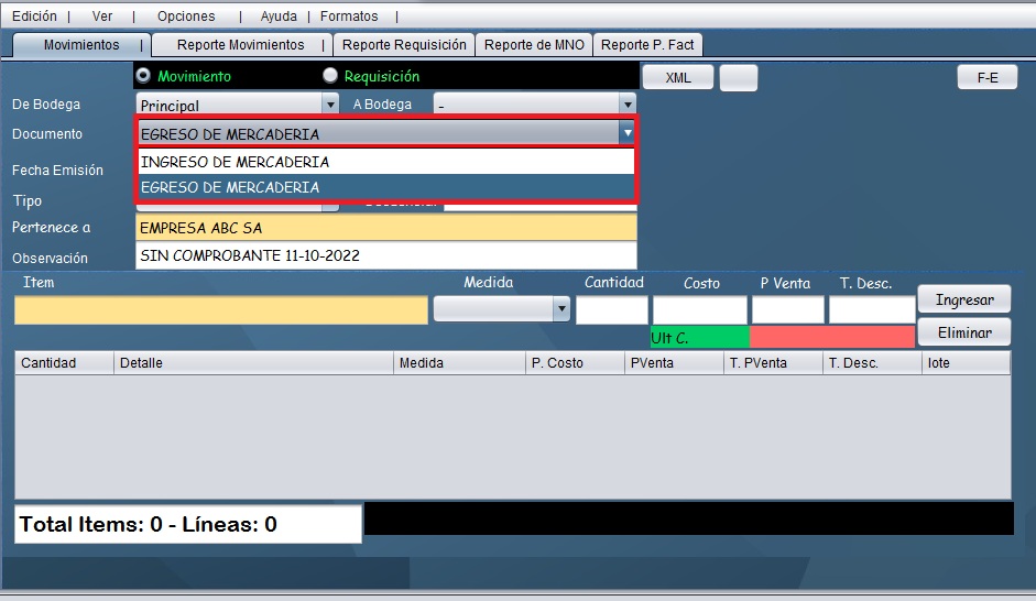 - En la opción "Documento" seleccione la opción "Egreso de mercadería".