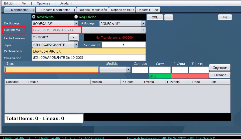- Seleccione los items que va a transferir, ingrese la cantidad, costo y presione el bot贸n "Ingresar".