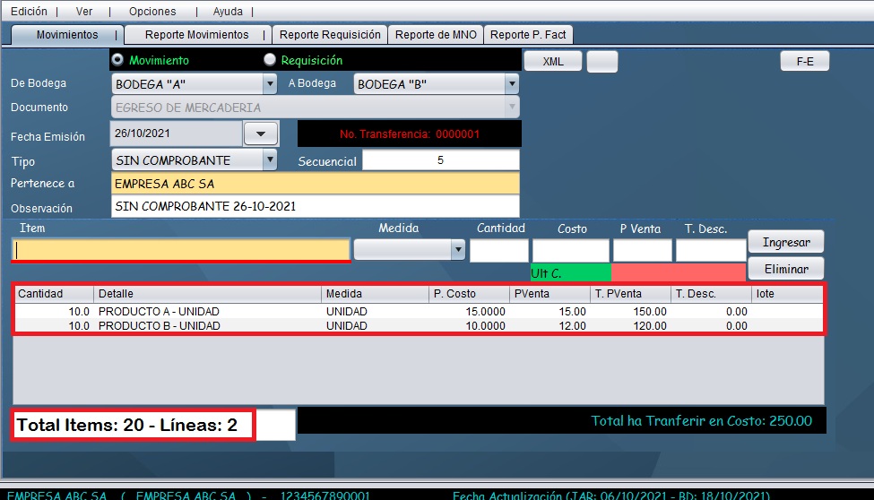 - En un s贸lo procedimiento puede transferir varios productos, al final de la pantalla se mostrar谩 el n煤mero de l铆neas y el total de productos que se van a transferir.