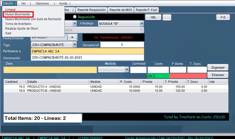 - Para guardar聽dir铆jase al men煤 "Edici贸n" y seleccione la opci贸n "Nuevo movimiento"