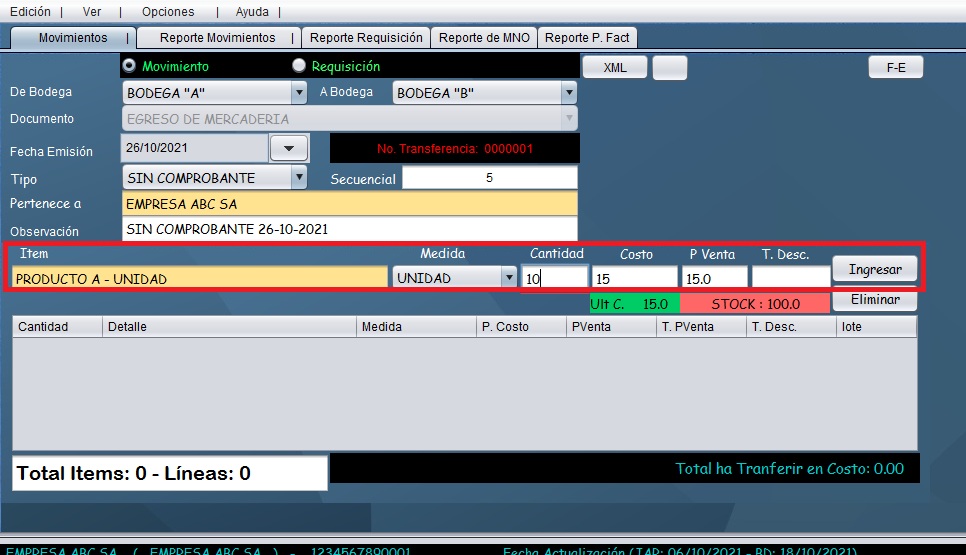 - Seleccione los items que va a transferir, ingrese la cantidad, costo y presione el bot贸n "Ingresar".