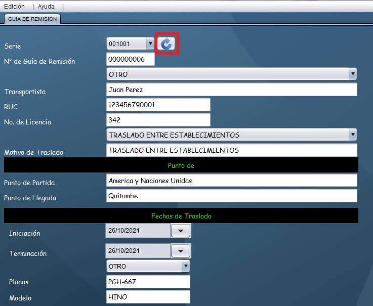- De clic en la flecha que se indica para cargar el secuencial, y proceda a llenar los datos de la guia de remisi贸n