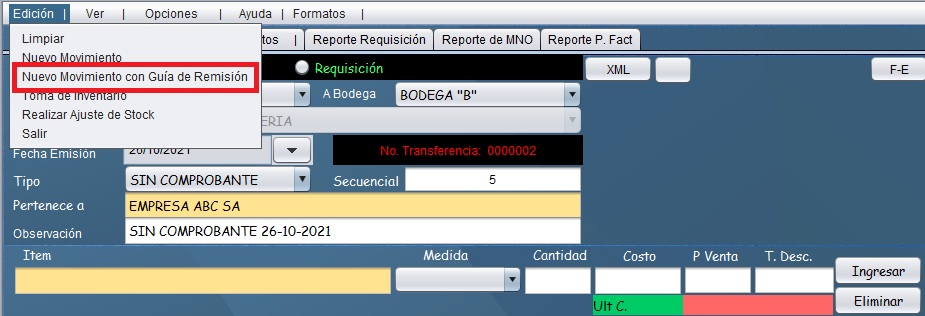 -聽聽Para guardar聽dir铆jase al men煤 "Edici贸n" y seleccione la opci贸n "Nuevo movimiento con guia de Remision"