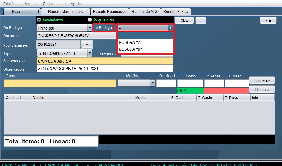 - Seleccione desde que bodega van a salir los productos y a que bodega van a ingresar.