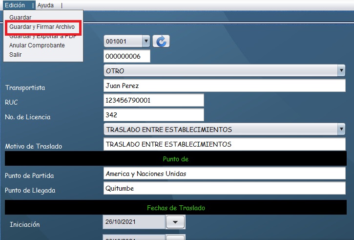 - Una vez llenos los datos, de clic en Edici贸n y Guardar y firmar archivo