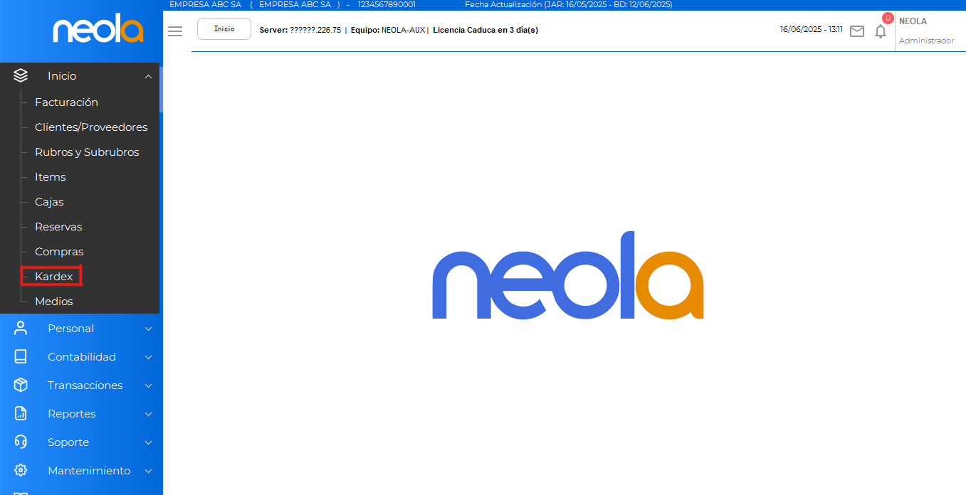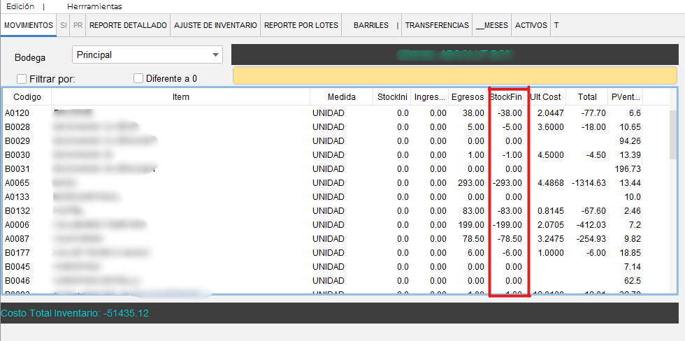 - En la pantalla principal de kardex, podrás visualizar todos los productos que fueron configurados para llevar control del stock, en la columna "StockFin" se mostrará la cantidad actual del producto.