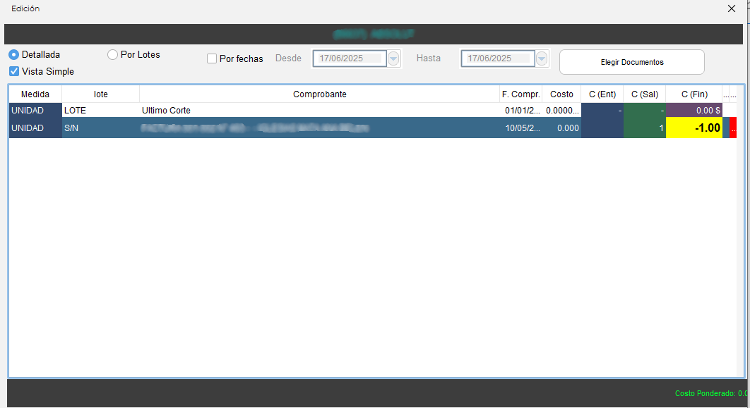 - Para visualizar el historial de cada producto, haz doble clic sobre el producto deseado y se mostrará la siguiente ventana con el detalle de ingresos y egresos.