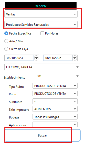 - En la siguiente pantalla seleccione "Ventas" y "Productos/servicios facturados" para poder obtener el reporte