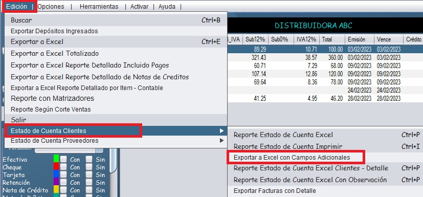 - Una vez colocados los filtros que necesita, dirijase a la pestaña Edicion, Estado de cuenta clientes y finalmente de clic en Exportar a Excel con campos adicionales