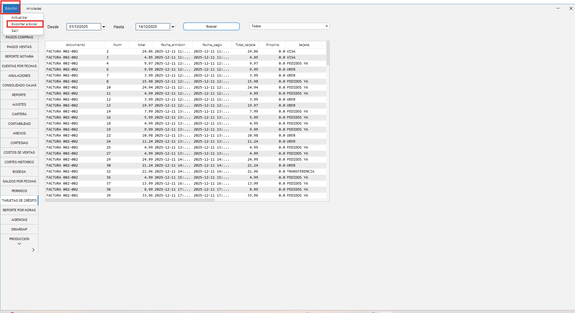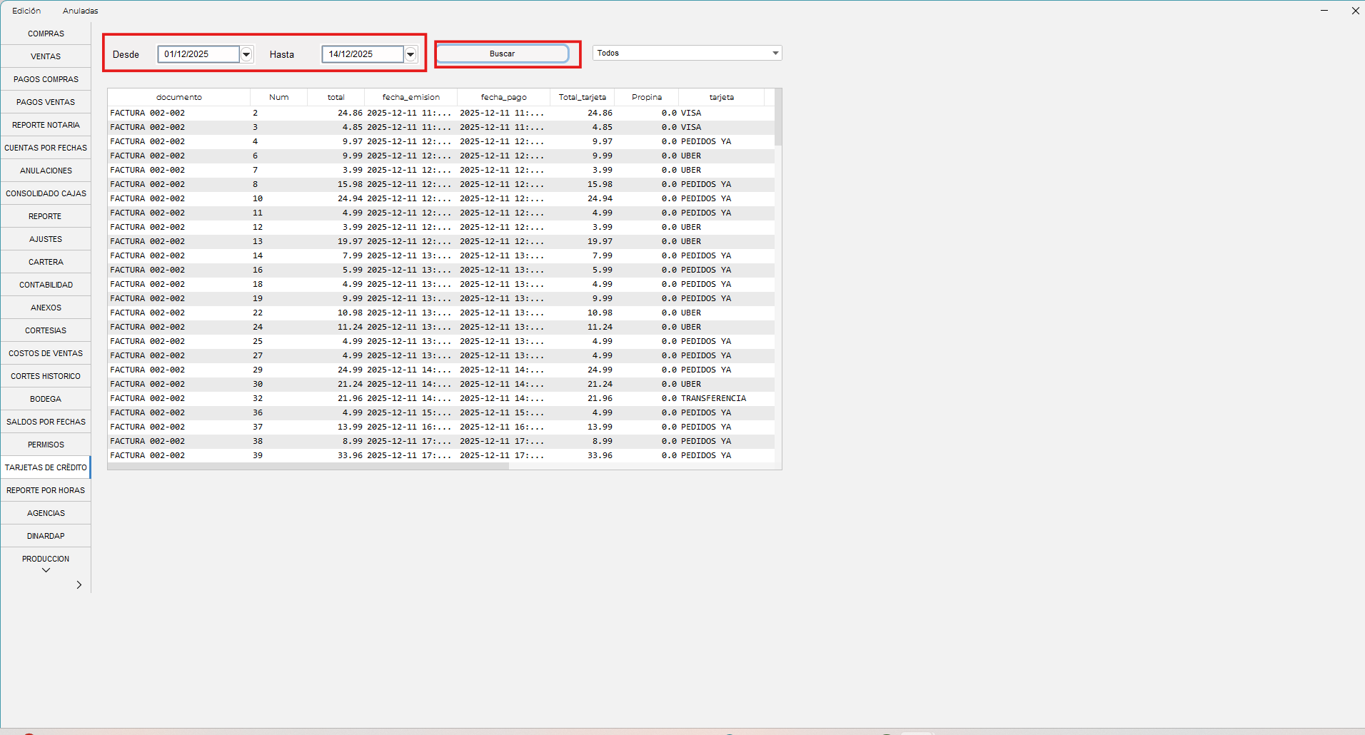 El sistema mostrar谩 el reporte de pagos con tarjeta de cr茅dito correspondiente a las fechas seleccionadas.