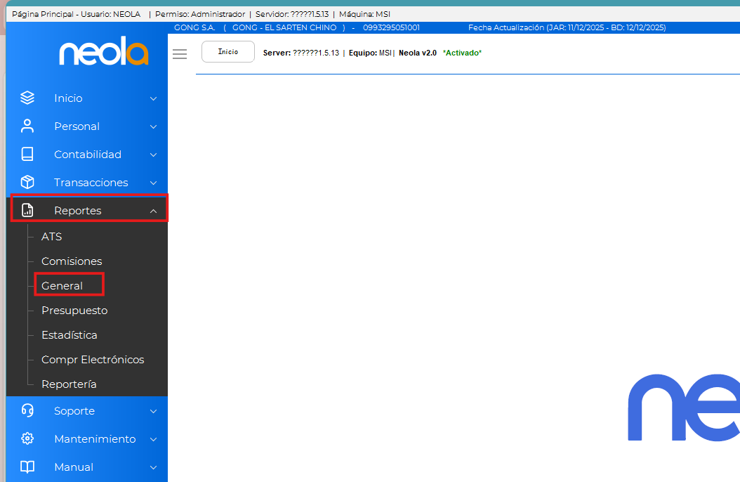 Dentro del sistema, dir铆gete a la secci贸n Reportes y luego selecciona General.