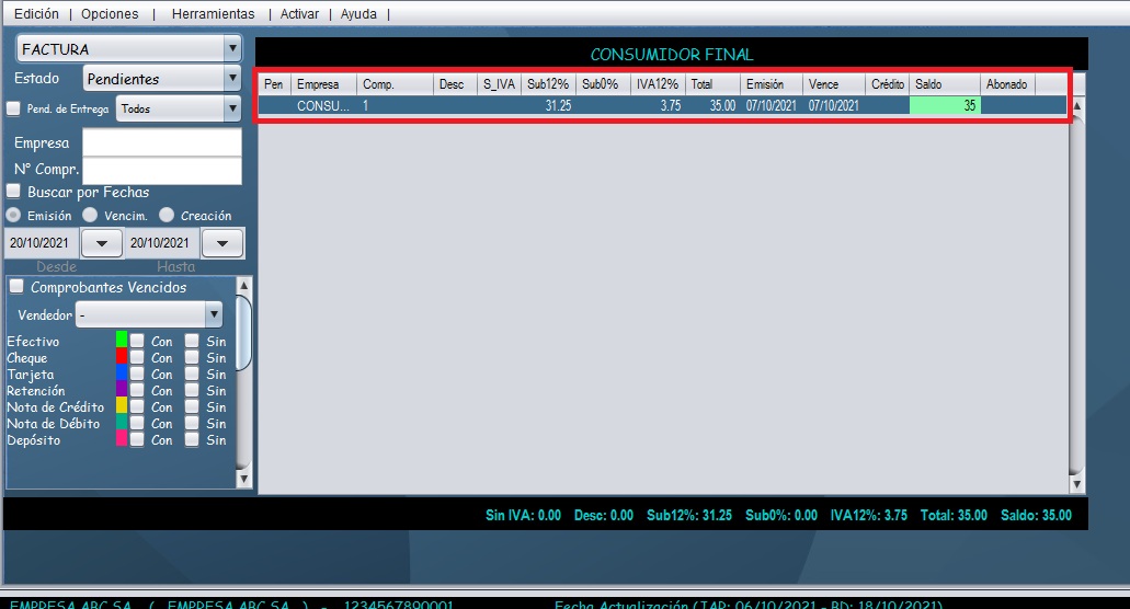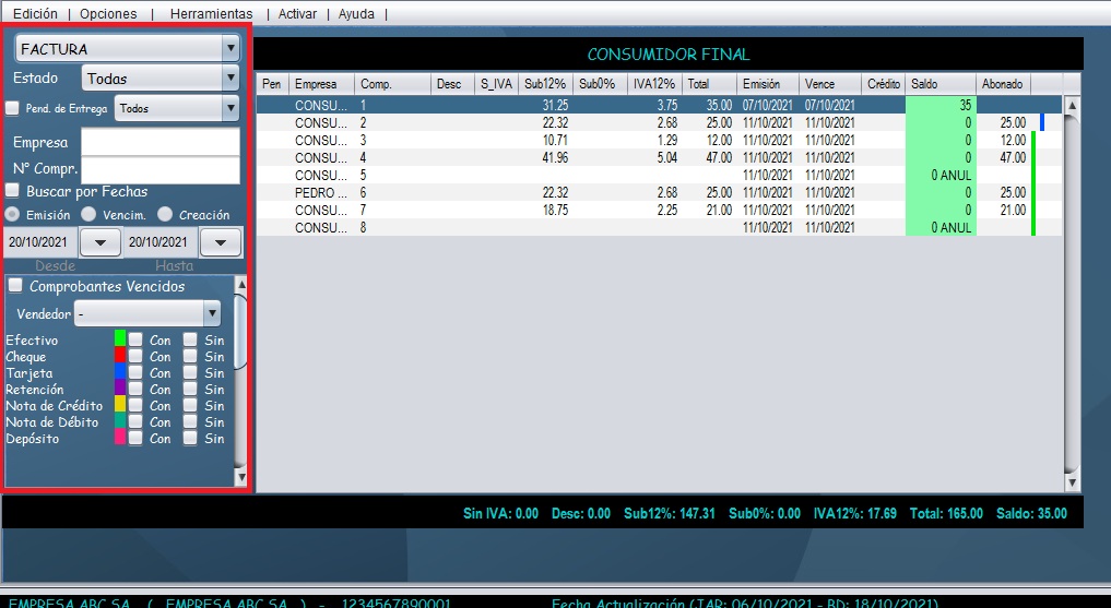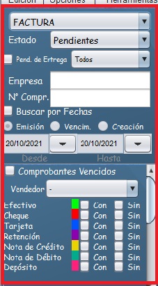 - Con ayuda de los filtros ubicados en la parte lateral izquierda, usted puede buscar comprobantes por: Cliente/Empresa, # de factura, fecha y tipo de pago.