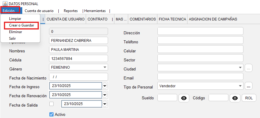 - Una vez que ingrese los datos, diríjase a la pestaña "Edición" y clic en "Crear o Guardar"