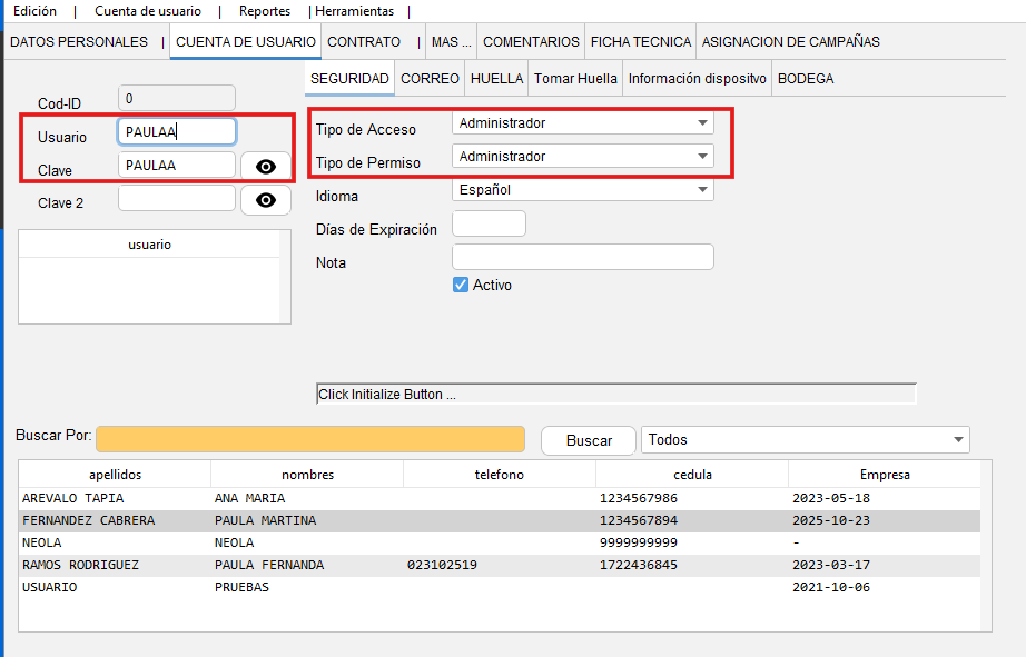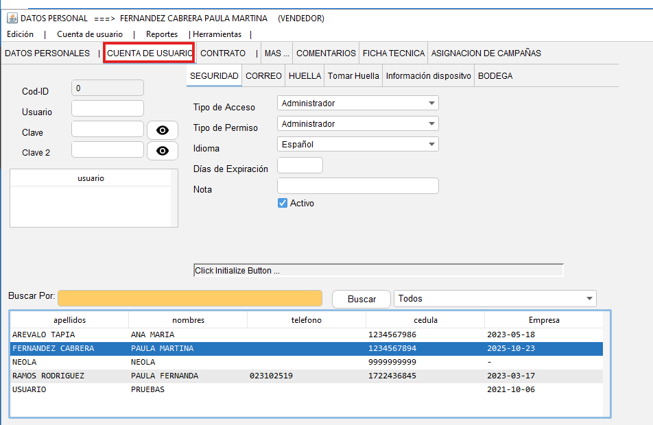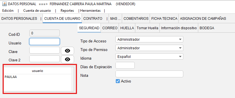 - En la parte inferior, con doble clic seleccione el personal al que le ve a crear la cuenta de usuario