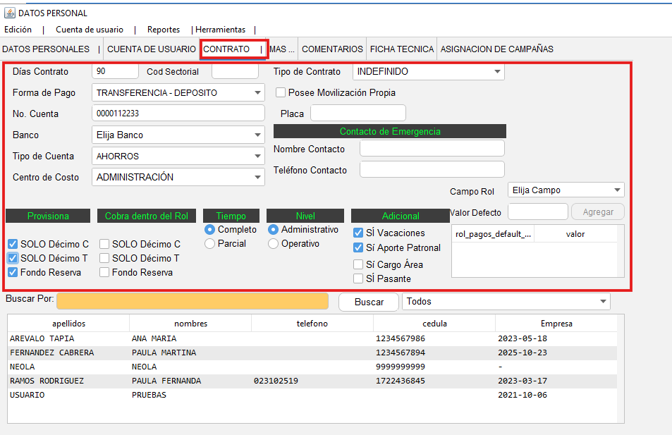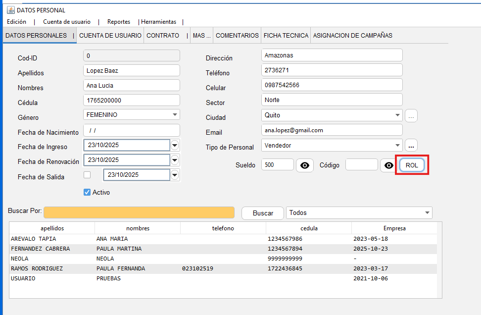 - Luego de completar la ficha de empleado, seleccione la opción "Rol" y "Rol de pagos"