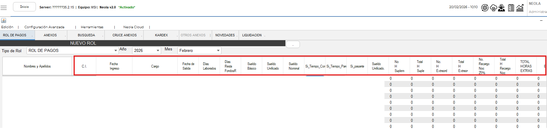 - Se abrirá la siguiente pantalla, donde estarán los campos necesarios para el rol de pagos (horas suplementarias, horas extras, bonos, comisiones,etc)