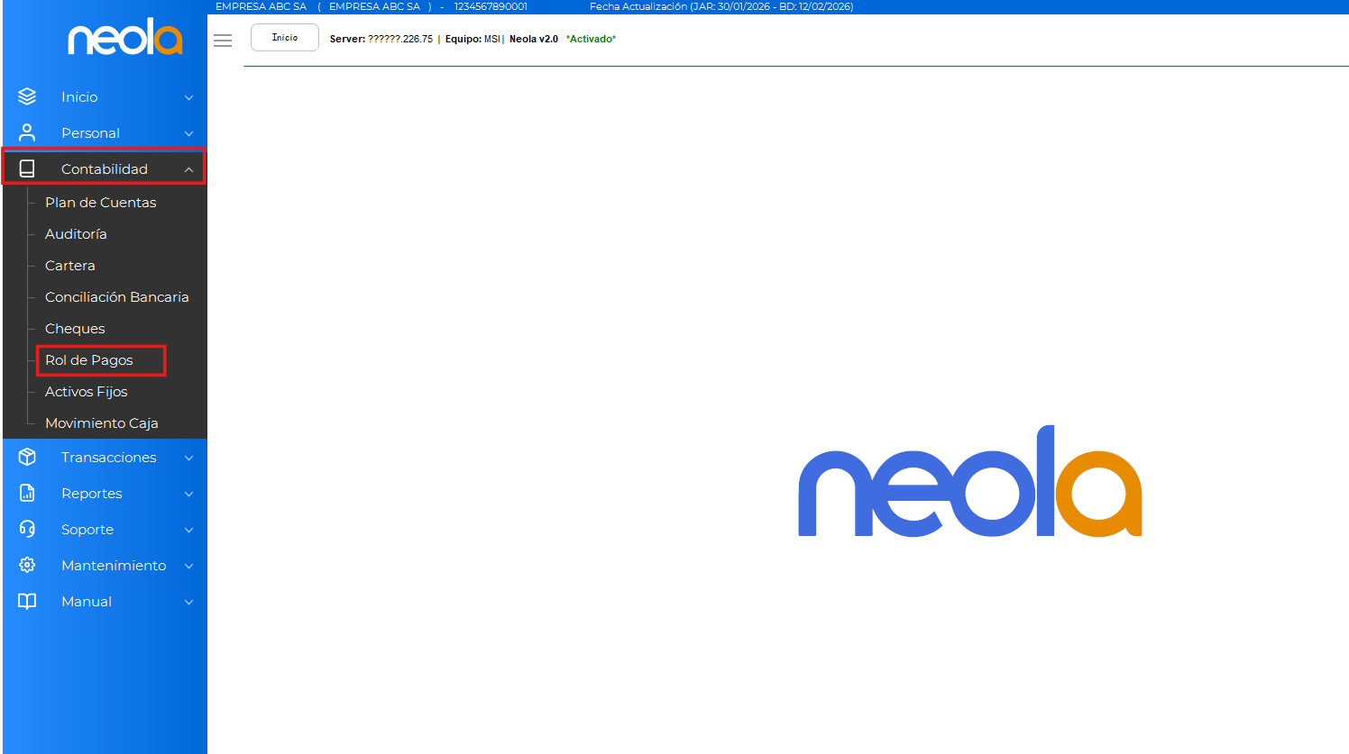 - Una vez creado el perfil, seleccione la pestaña de "Contabilidad" y de clic en la opción de "Rol de pagos"