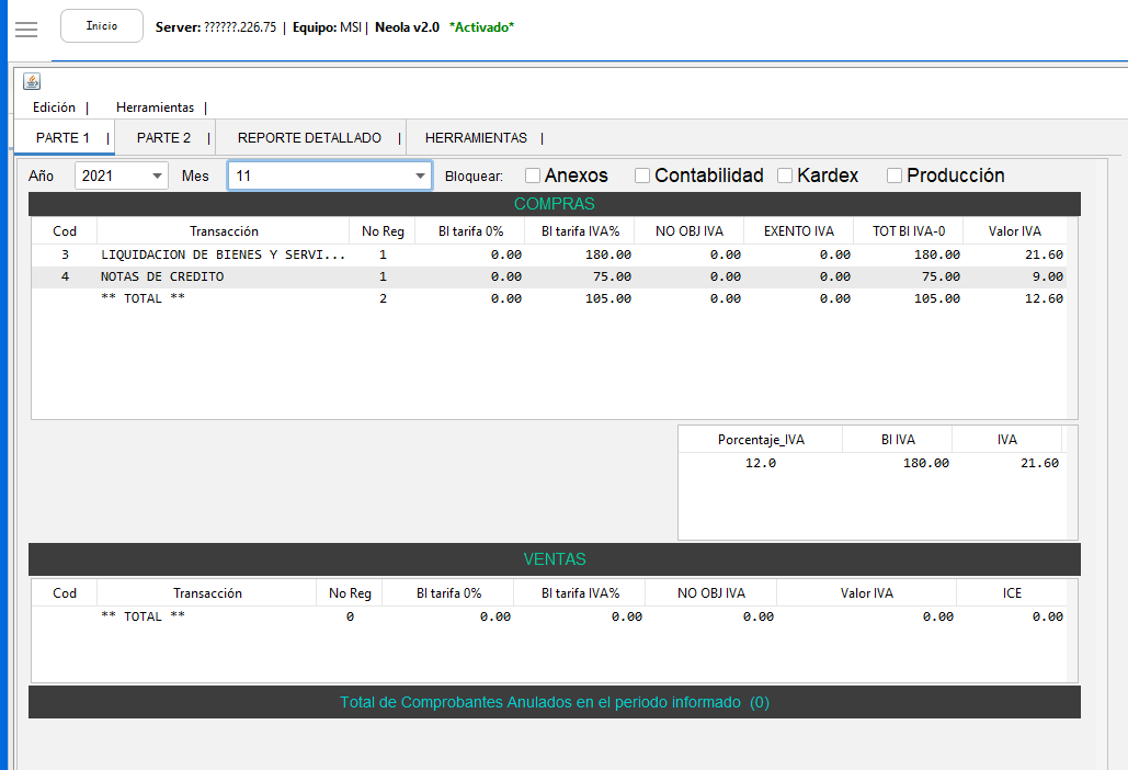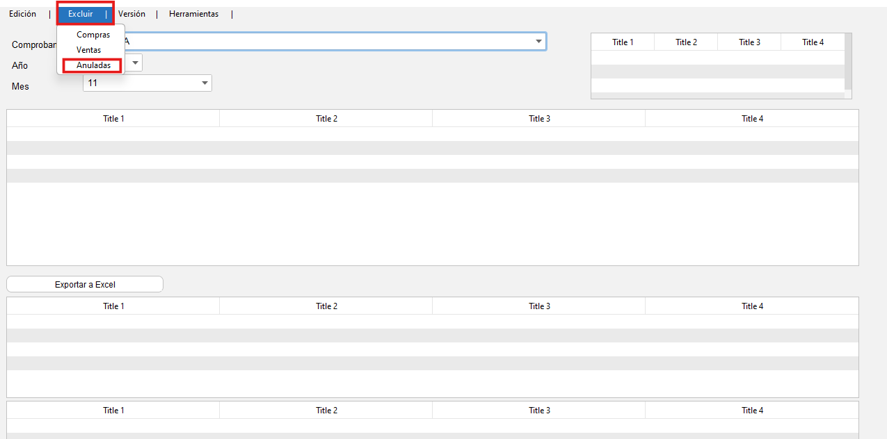 - En “Comprobantes” seleccione las ventas o compras según el serial que esté utilizando, una vez realizado este proceso damos clic en la opción “Excluir” y seleccione “Anuladas”. (En el caso de que no existan ventas en el período, también se deben excluir la opción "Ventas").