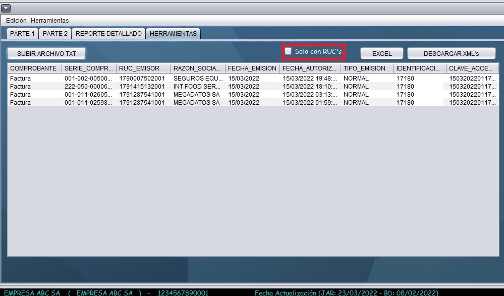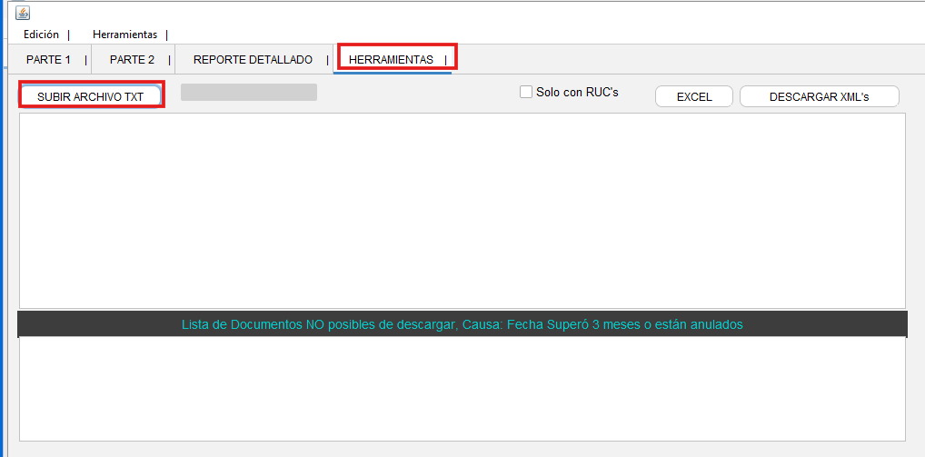 - Seleccione la pestaña de herramientas y haga clic en la opción "Subir archivo txt". Abra el archivo txt que se descargo previamente de la página del SRI
