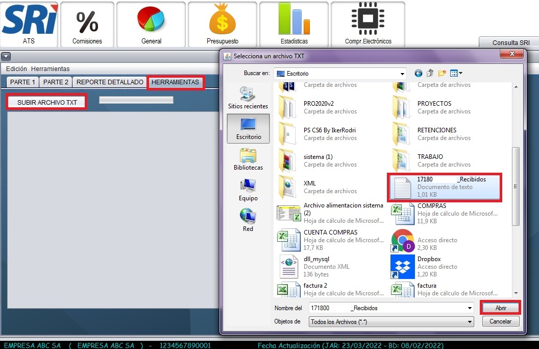 - Seleccione la pestaña de herramientas y haga clic en la opción "Subir archivo txt". Abra el archivo txt que se descargo previamente de la página del SRI