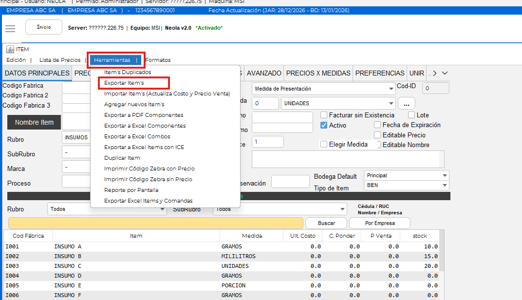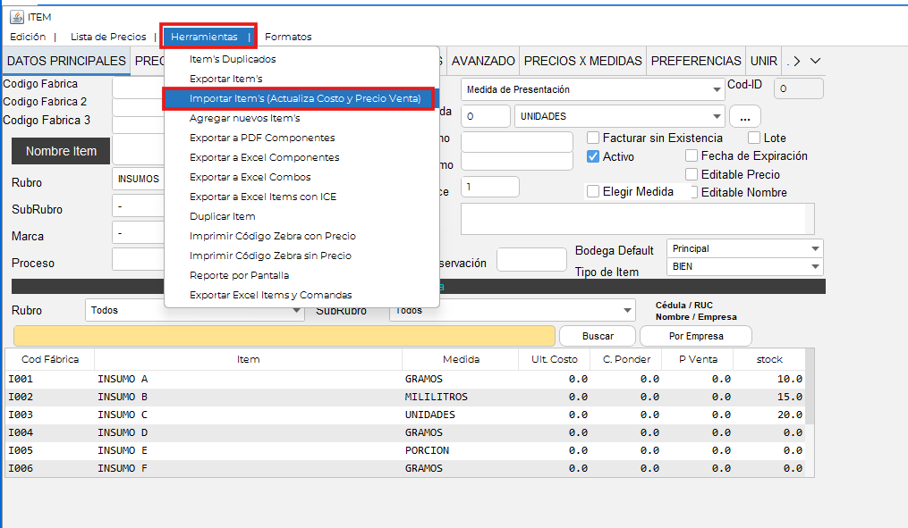 - A continuación, guarde el archivo en la carpeta que usted desee y cierre el archivo de Excel, de vuelta al sistema en la misma pantalla que está trabajando diríjase a “Herramientas” y seleccione la opción “Importar items (Actualiza costo y precio de venta)” .