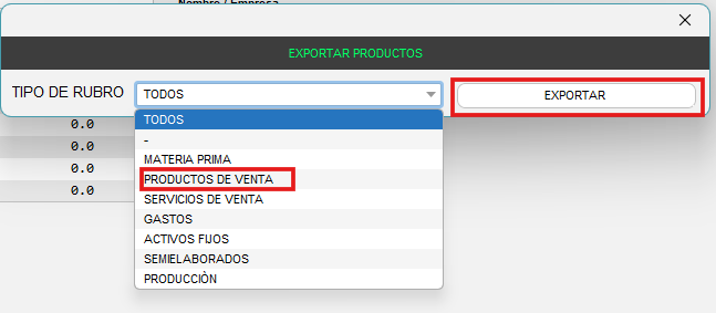 - Seleccione "Productos de venta " o “Ventas” y presione el botón “Exportar”