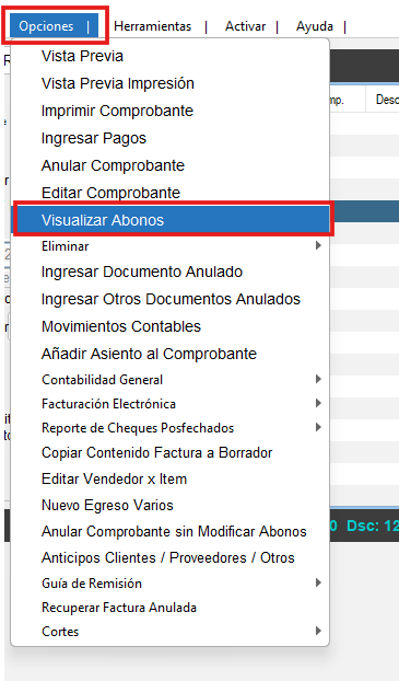 - Selecciona la factura que se anulará y haz clic en “Opciones” >“Visualizar abonos”.