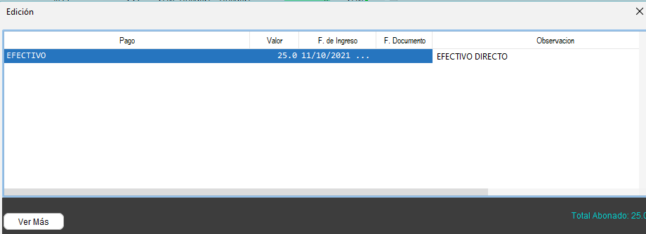 - Se mostrará la siguiente pantalla donde se muestran todos los pagos registrados en ese comprobante.