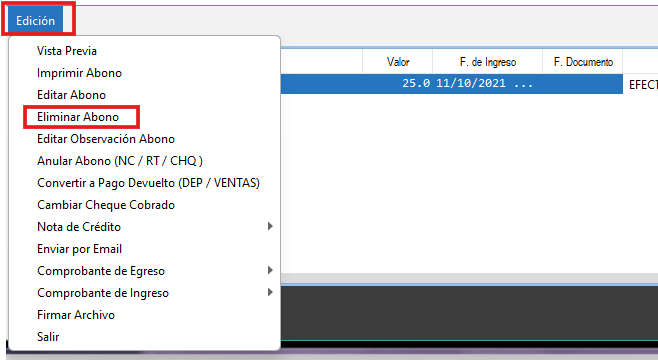 - Selecciona el abono que se eliminará y clic en “Edición” > "Eliminar abono”.