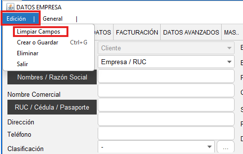 - Para iniciar asegúrese de que el formulario se encuentra vacío, dé clic en "Edición" y seleccione la opción "Limpiar campos".