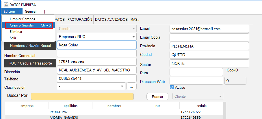 - Una vez ingresados los datos, diríjase nuevamente al menú "Edición" y seleccione la opción "Crear o guardar"