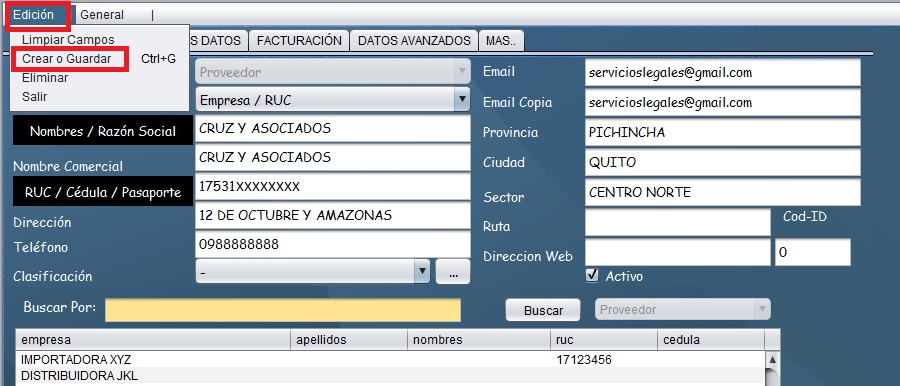 - Una vez ingresados los datos, dir铆jase nuevamente al men煤 "Edici贸n" y seleccione la opci贸n "Crear o guardar", se mostrar谩 un mensaje de confirmaci贸n presione el bot贸n "Si".