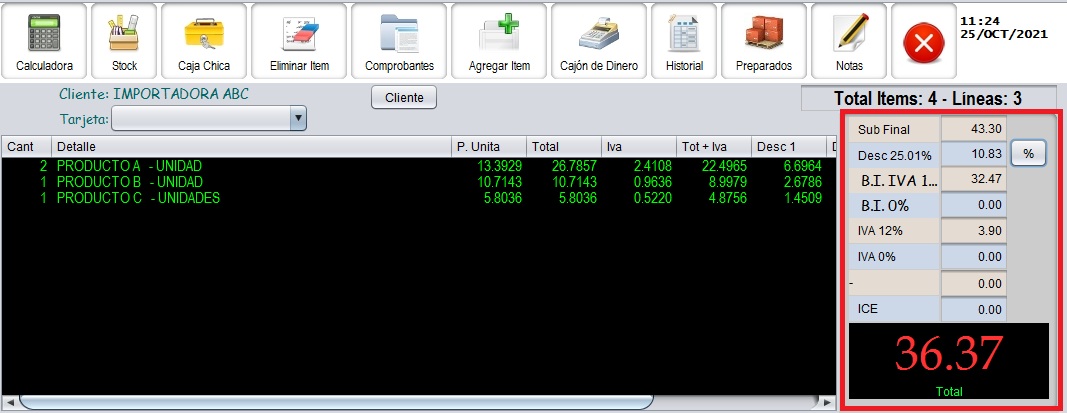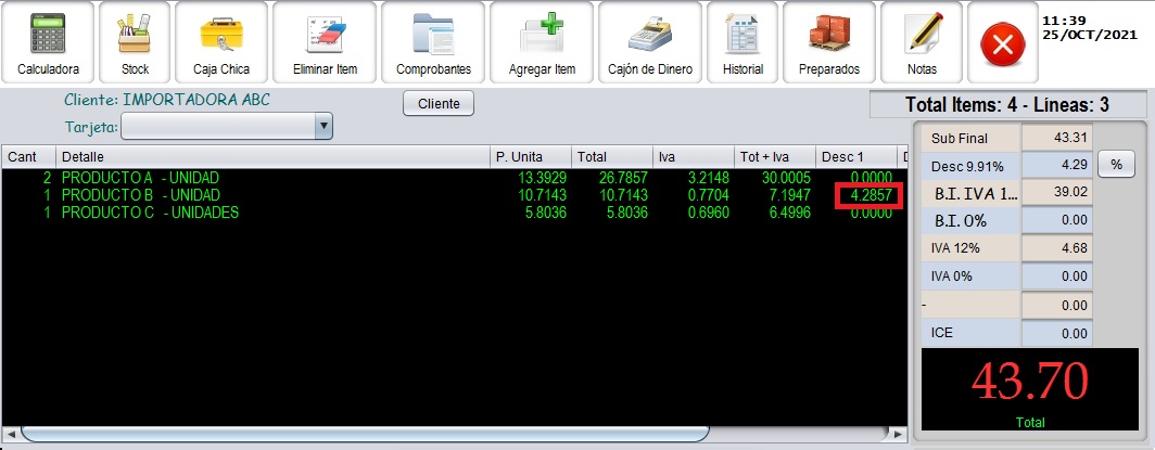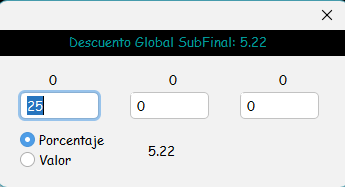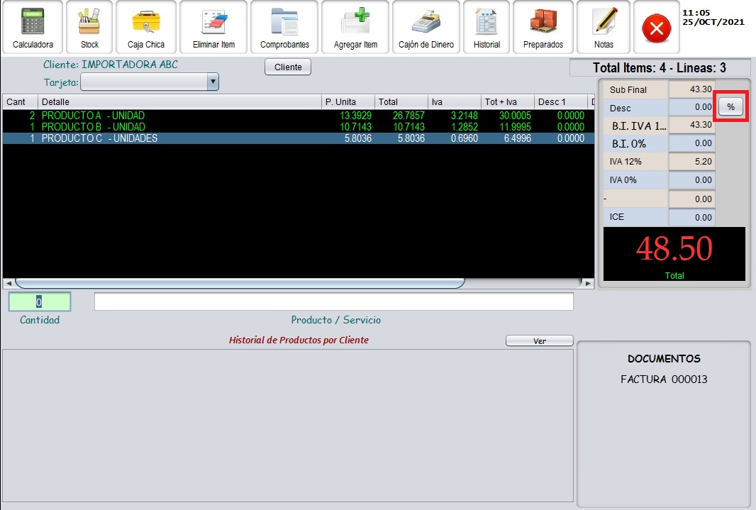 - Presiona el botón enter 3 veces y la ventana se cerrará, aplicando el porcentaje de descuento que colocaste a toda la factura.