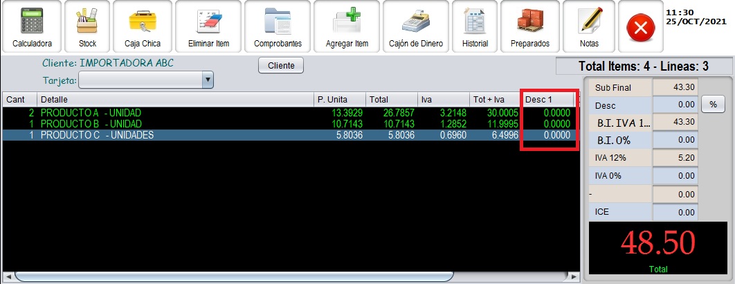 - Selecciona el ítem al que se aplicará el descuento y haz doble clic en cantidad en la columna "Desc 1"