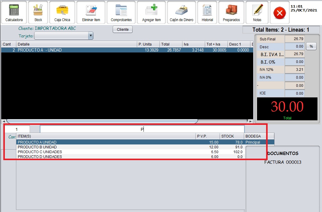 - Para elegir haz doble clic sobre el producto o presiona la tecla enter, repite el procedimiento hasta seleccionar todos los ítems que deseas facturar.