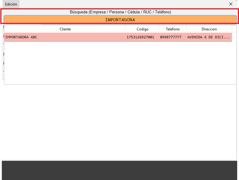- Ingresa el RUC/cédula o el nombre del cliente, si ya existe, en el sistema se desplegará una lista de coincidencias para poder seleccionar el cliente deseado. En caso de que no se encuentre coincidencia, consulta en nuestro manual el capítulo Creación del cliente.