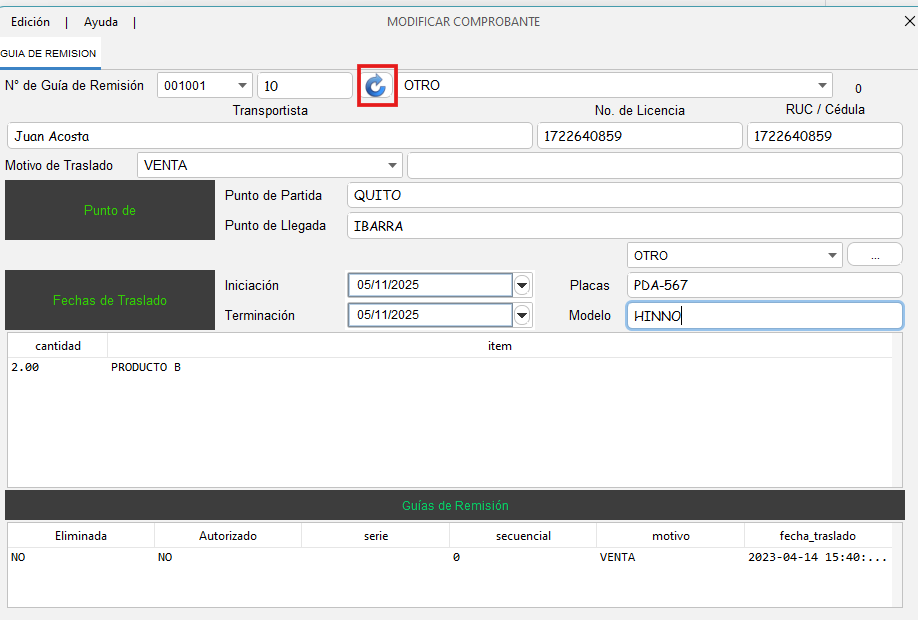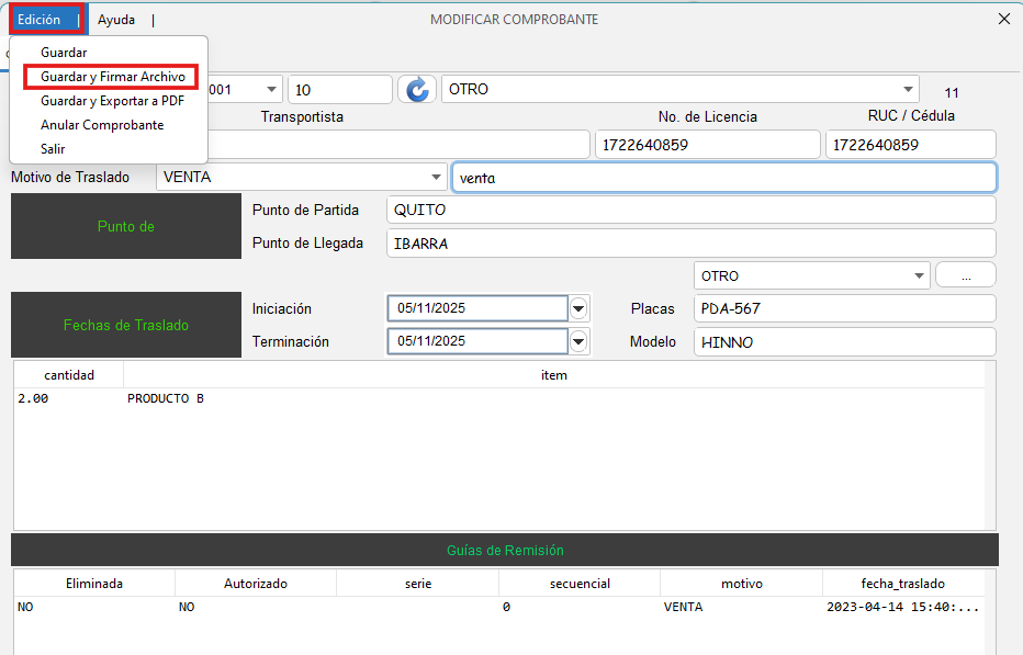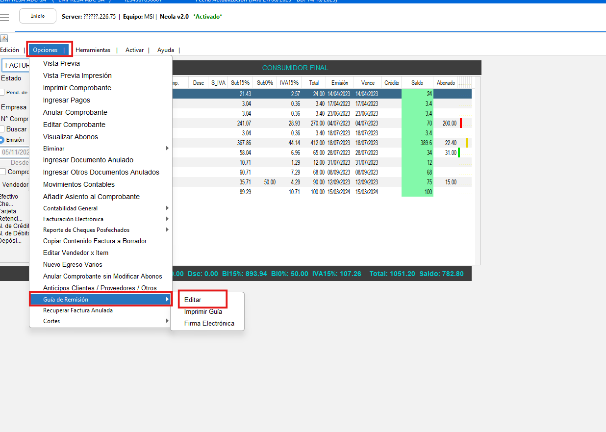 - Escoge la factura con la que se emitirá la guía de remisión, ve a Opciones >Guia de Remisión >Editar